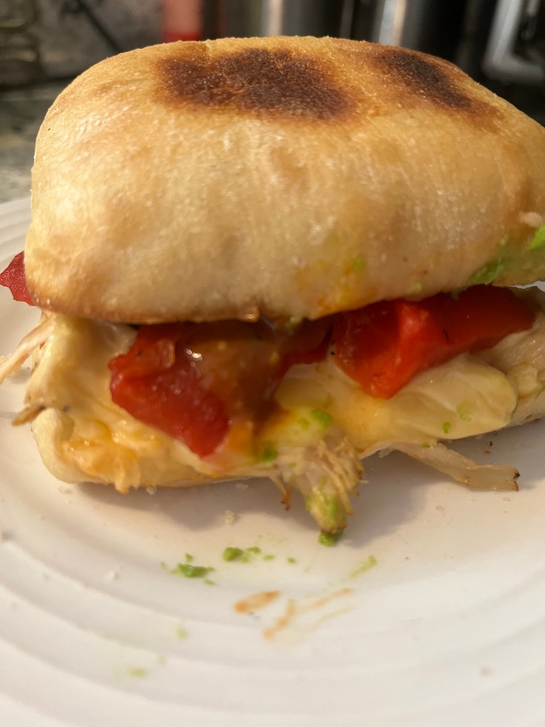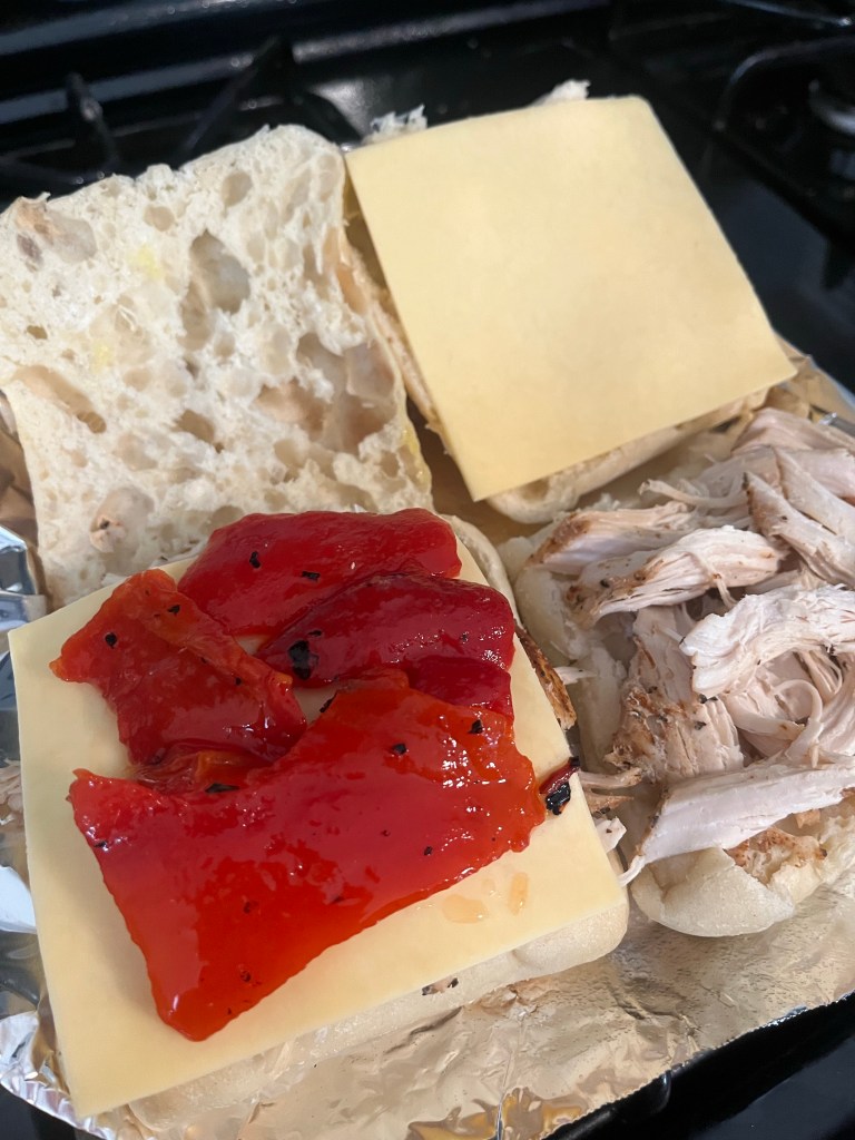 5. Shred chicken and place one layer on bottom bun of ciabatta. Add Gouda cheese and 1 layer of roasted red peppers. Toast until melted and bread is light brown.