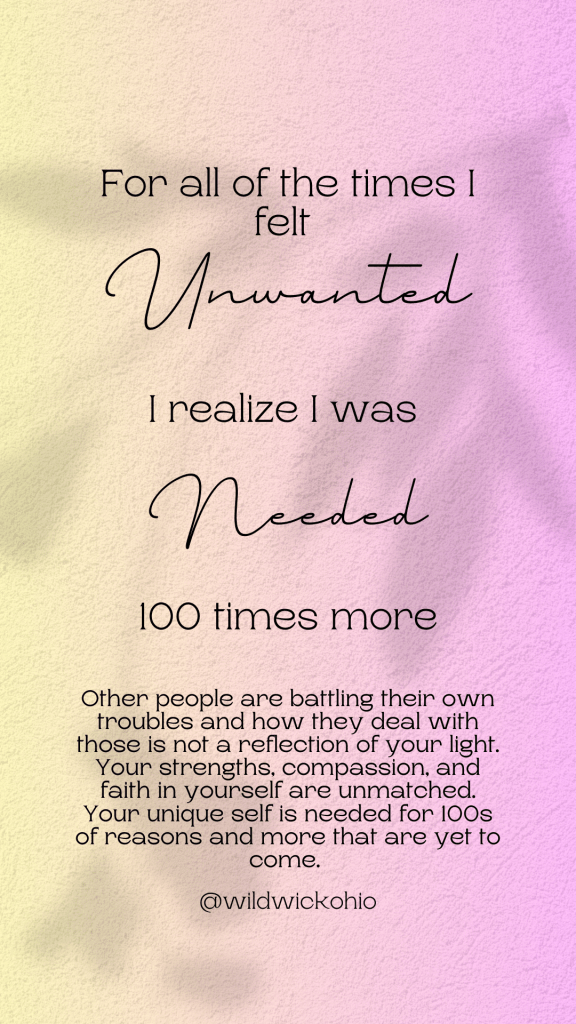 This week, motivation Monday is about not taking things personally. Feeling unwanted or unneeded is honestly sometimes an overreaction. However, there are times when we are purposefully made to feel unwanted. We need to remember not to take the words Unneeded and Unwanted to heart. Focusing on the past, present, and future times in which we are needed is key to getting over the hurtful things people say on accident or on purpose.