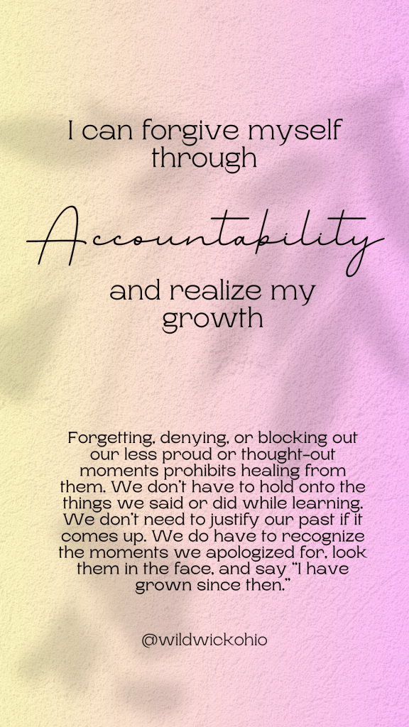 We don’t want to think about it, and we most certainly don’t want to relive some thing we weren’t proud of, or something that we knew hurt others. Accountability is the tool that keeps you from living in the past. You don’t have to think in-depth about reasons, justification, or why you could’ve actually been right. All you need to do is realize that you’ve grown since then. That’s it. It was a moment. It was the past. It didn’t last. And you owe it to yourself to grow from that. Completely blocking the memory will just cause you more trauma. You owe it to yourself to forgive with accountability and growth.